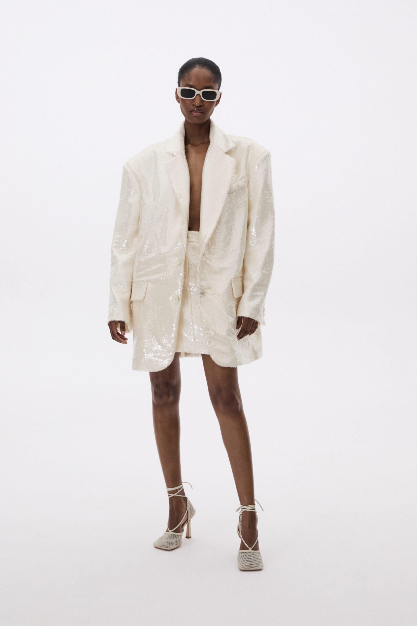 Elegant double layer sequin blazer of medium length. Features dummy pockets. Button fastened.