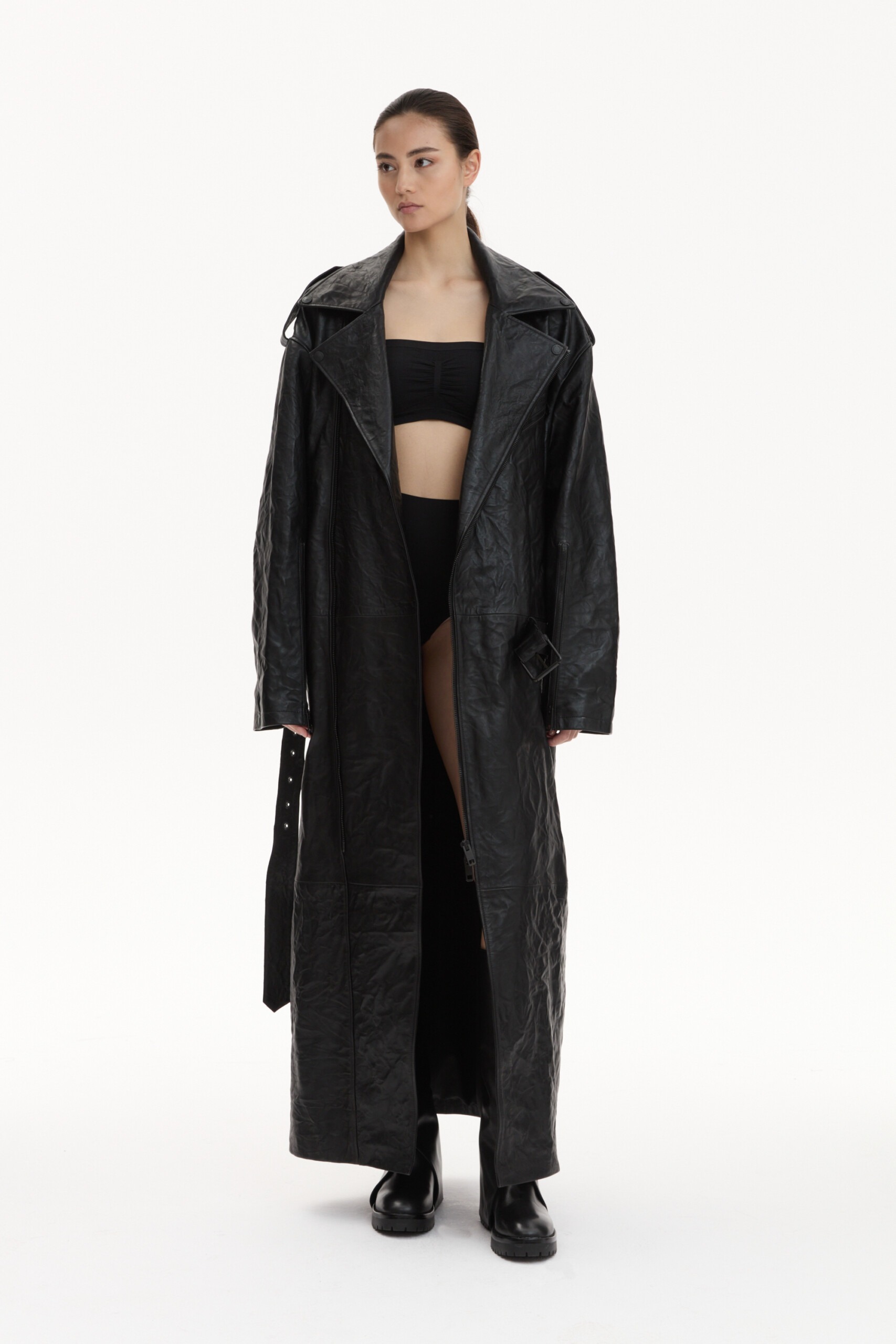 Long, black, leather trench coat with a belted waist. Wide lapels. Double-breasted design. Floor-length. Elegant, classic, and sophisticated.