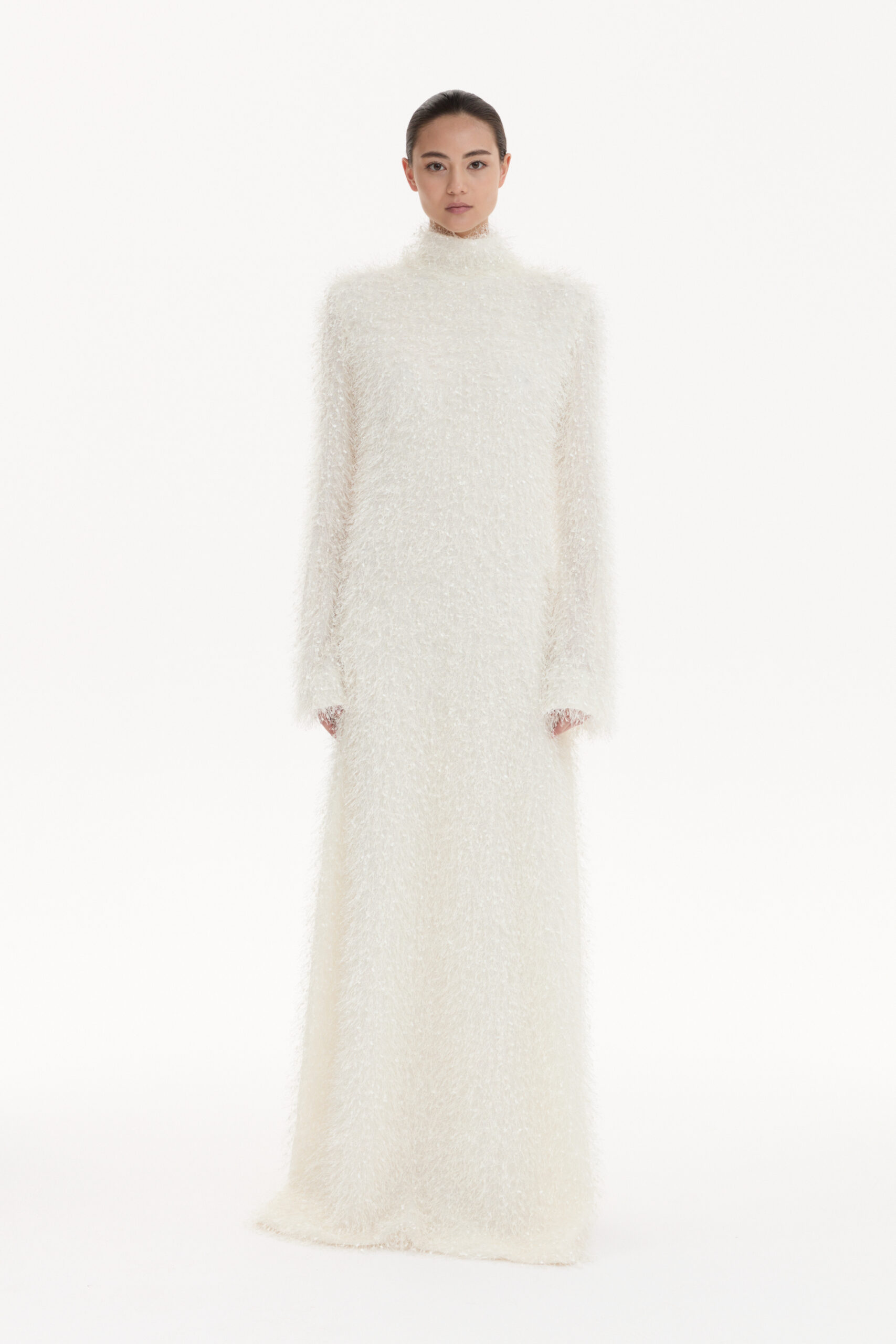 Long, white dress with a high neckline. The fabric is fluffy and textured, creating a soft and ethereal look. Long sleeves and a floor-length design. Elegant and understated.