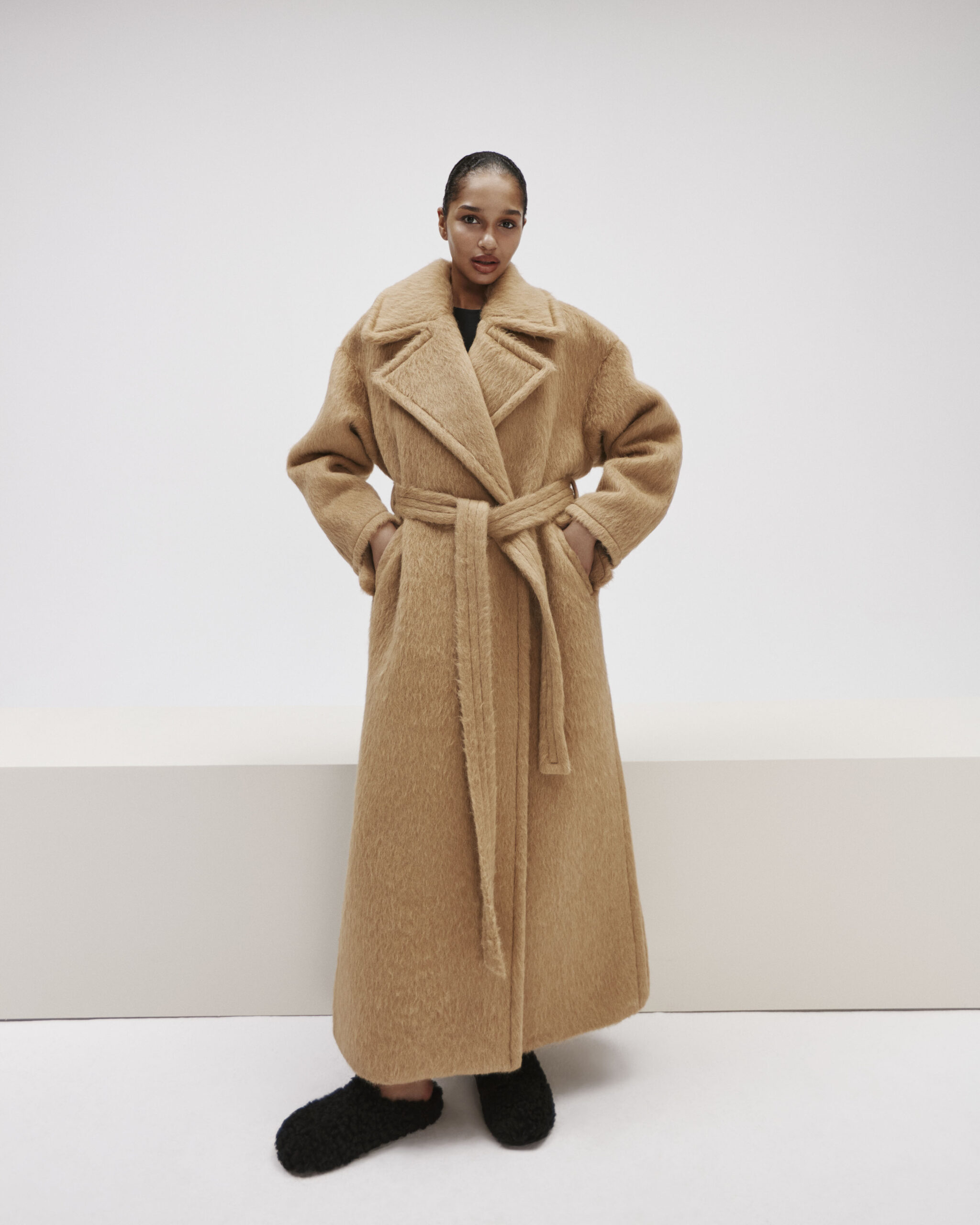 Floor-length camel wool coat, adorned with a wide collar and tied at the waist with a belt.