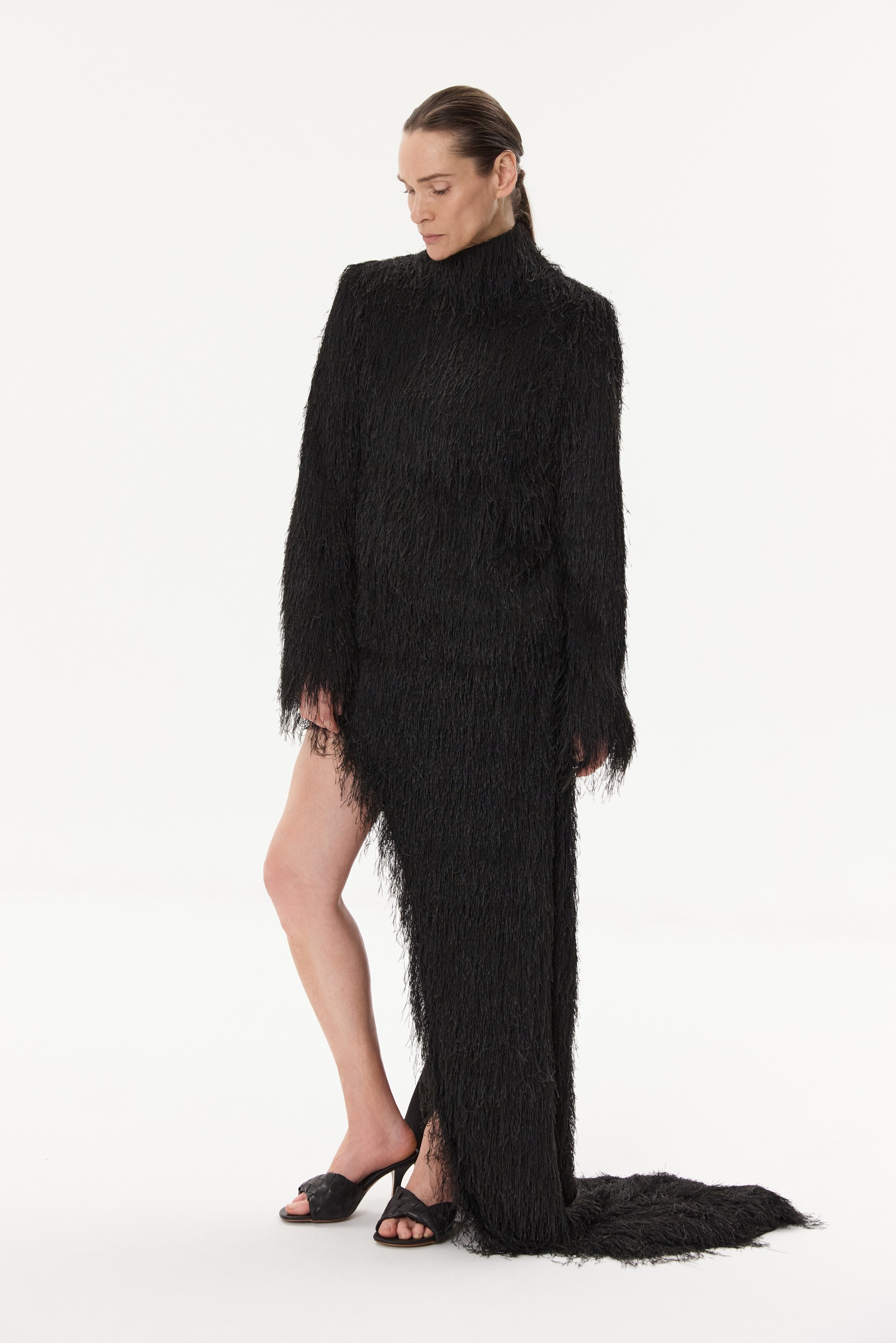 Long dress with a high neckline. The fabric is fluffy and textured. Long sleeves and floor-length design. Features a side slip.