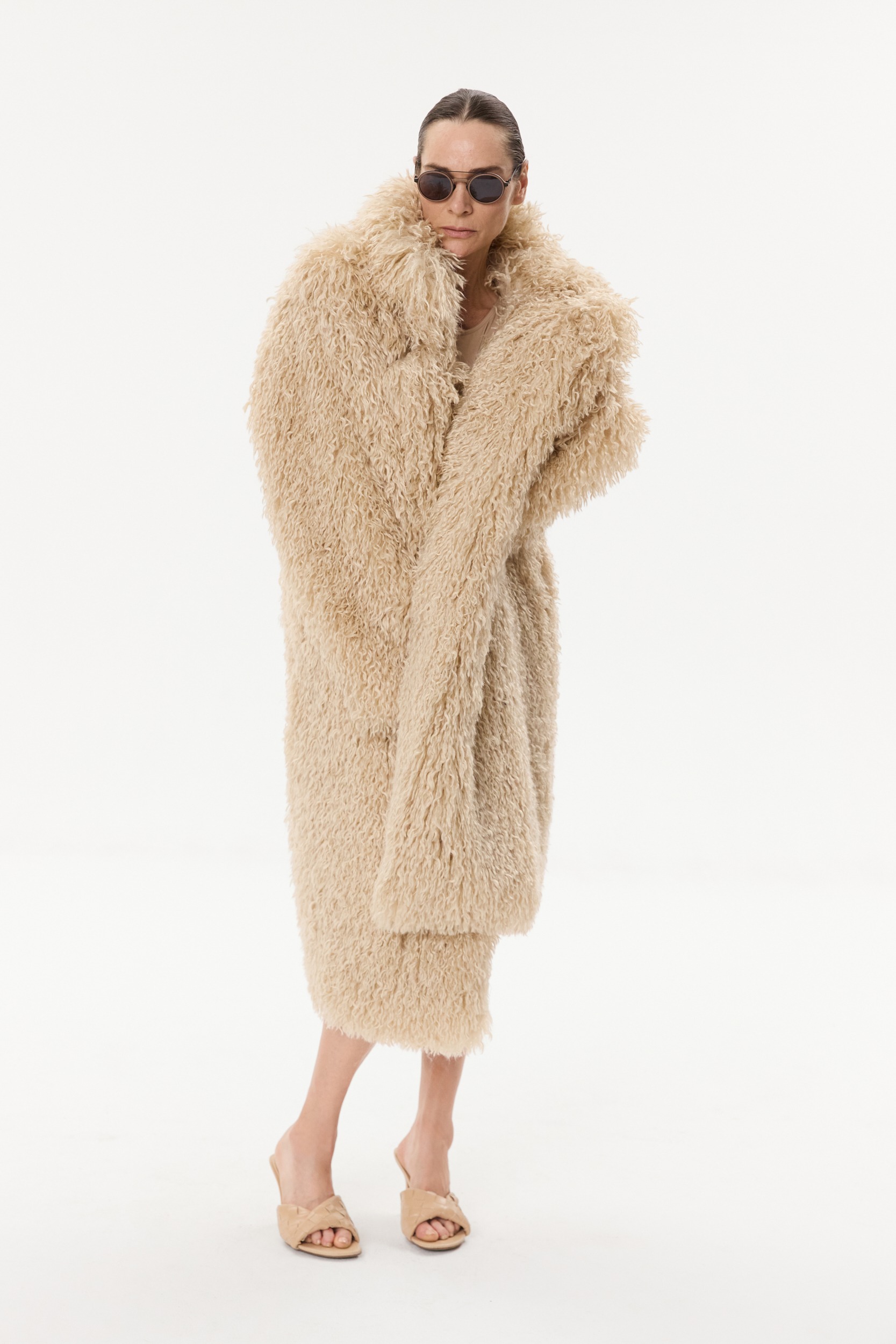Fur coat with a fluffy texture. Oversized silhouette. High collar. Long sleeves.