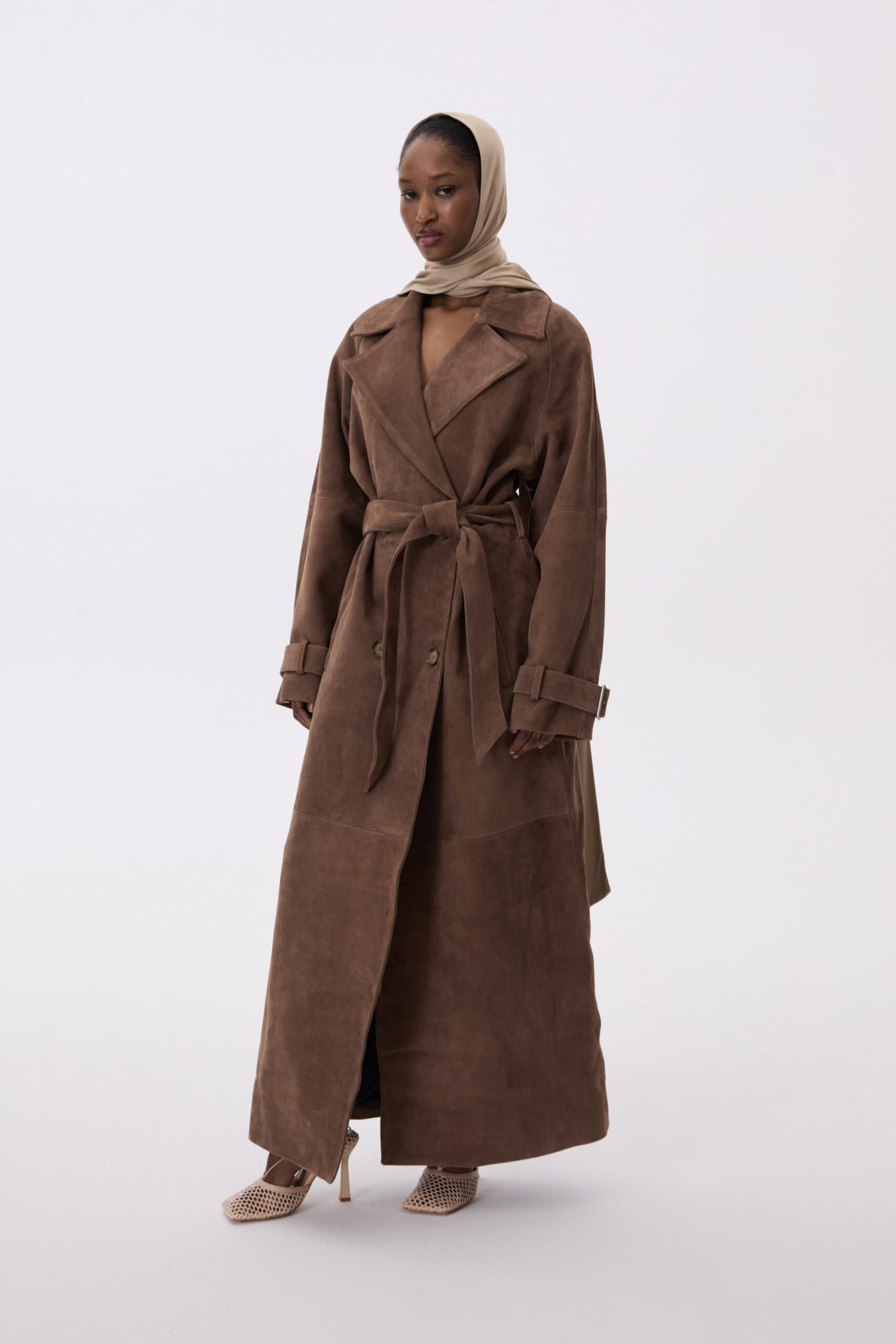 Floor-length coat fastened with buttons. Accentuated with a waist belt and wide lapels.