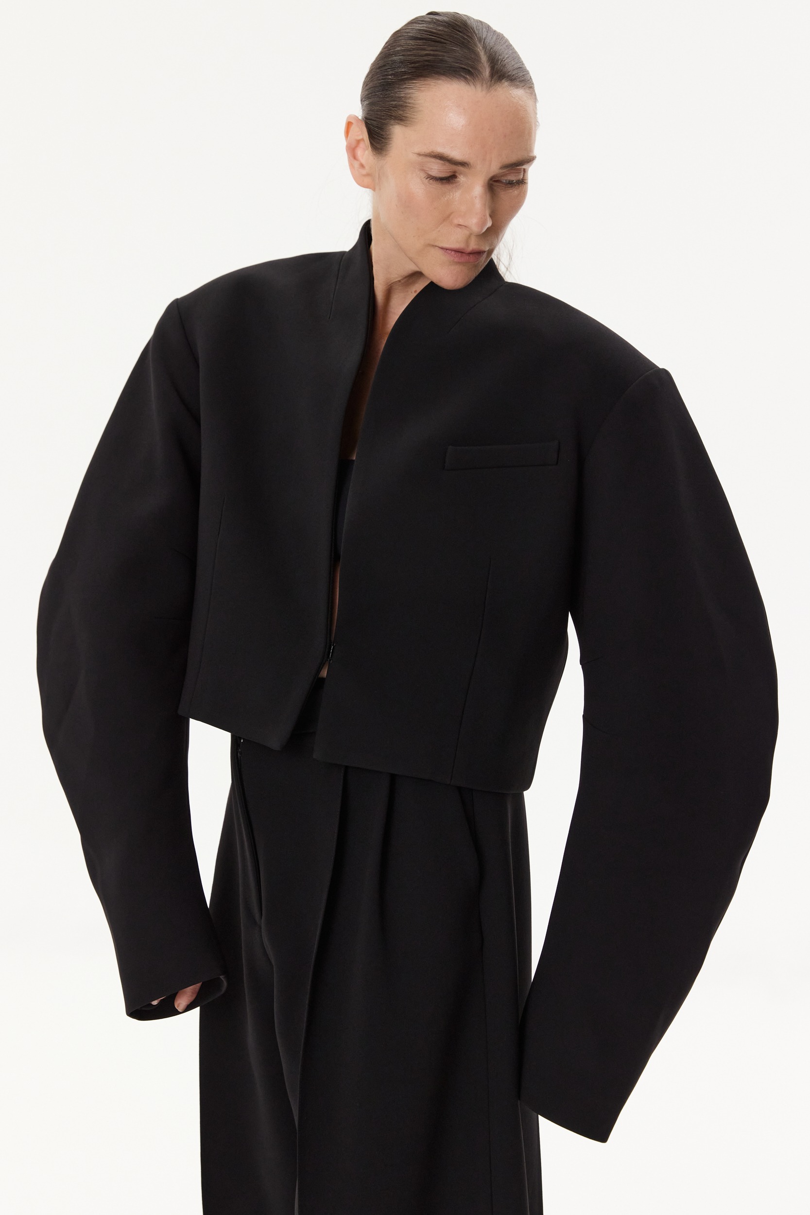 Modern short-cut blazer. Fastened with press studs. Fancy long sleeves.
