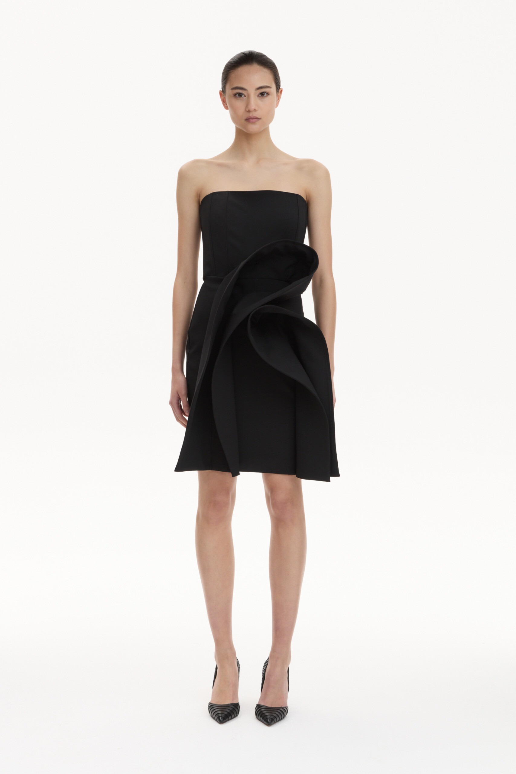 Short, corset dress with a fitted bodice, features an asymmetrical draped detail cascading down the front. Elegant, bold, and contemporary, perfect for formal events.