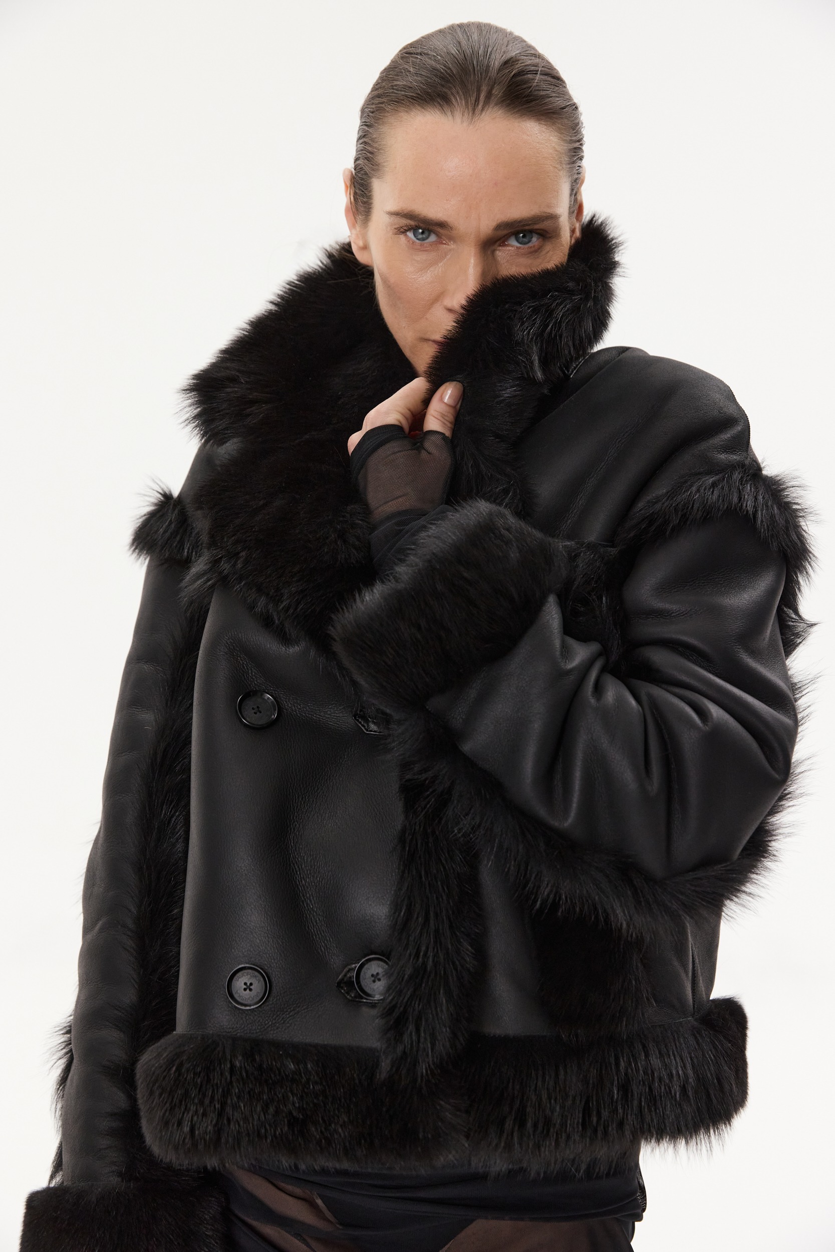 Double-breasted short jacket made of leather fabric. Finished with fluffy cuffs and collar. Fastened with buttons